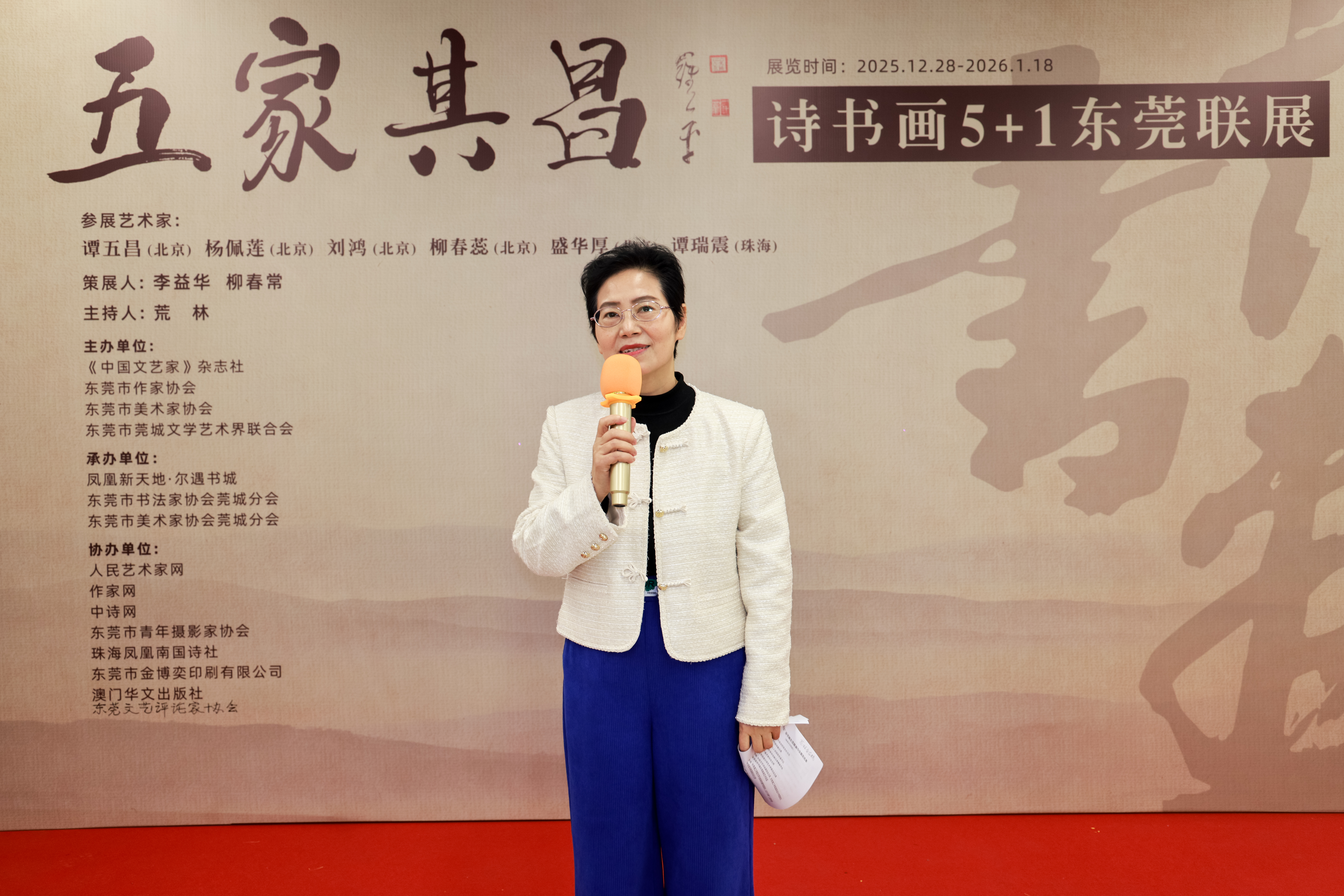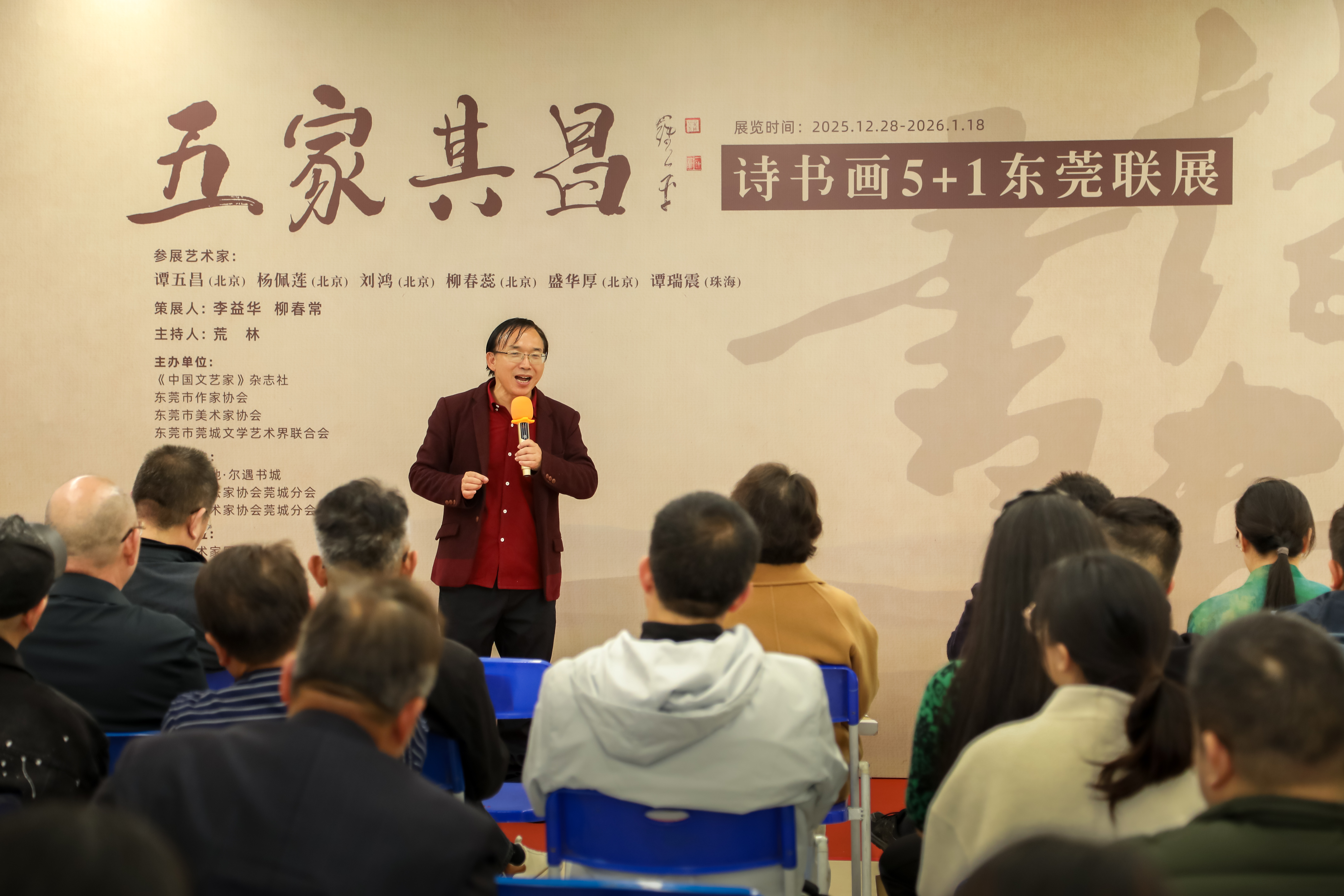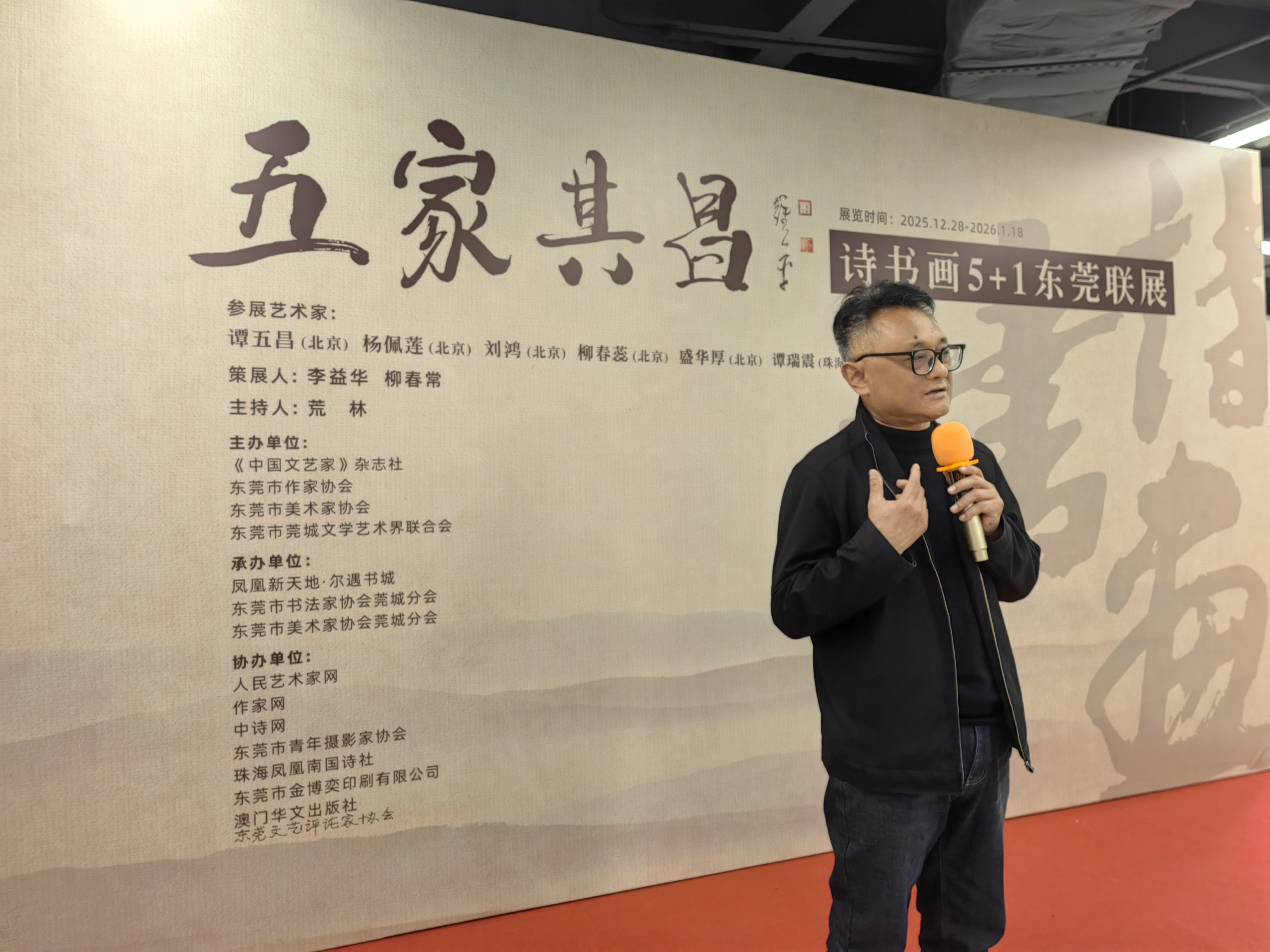 2025年12月28日,“五家其昌”诗书画5+1东莞联展开幕式在东莞市凤凰新天地尔遇书城隆重举行。本次联展由《中国文艺家》杂志社、东莞市作家协会、东莞市美术家协会、东莞莞城文学艺术界联合会主办,凤凰新天地尔遇书城、东莞市书法家协会莞城分会、东莞市美术家协会莞城分会承办,并得到人民艺术家网、作家网、中诗网、东莞市青年摄影家协会、珠海南国凤凰诗社、东莞市金博奕印刷有限公司、澳门华文出版社、东莞文艺评论家协会等单位的协办支持。